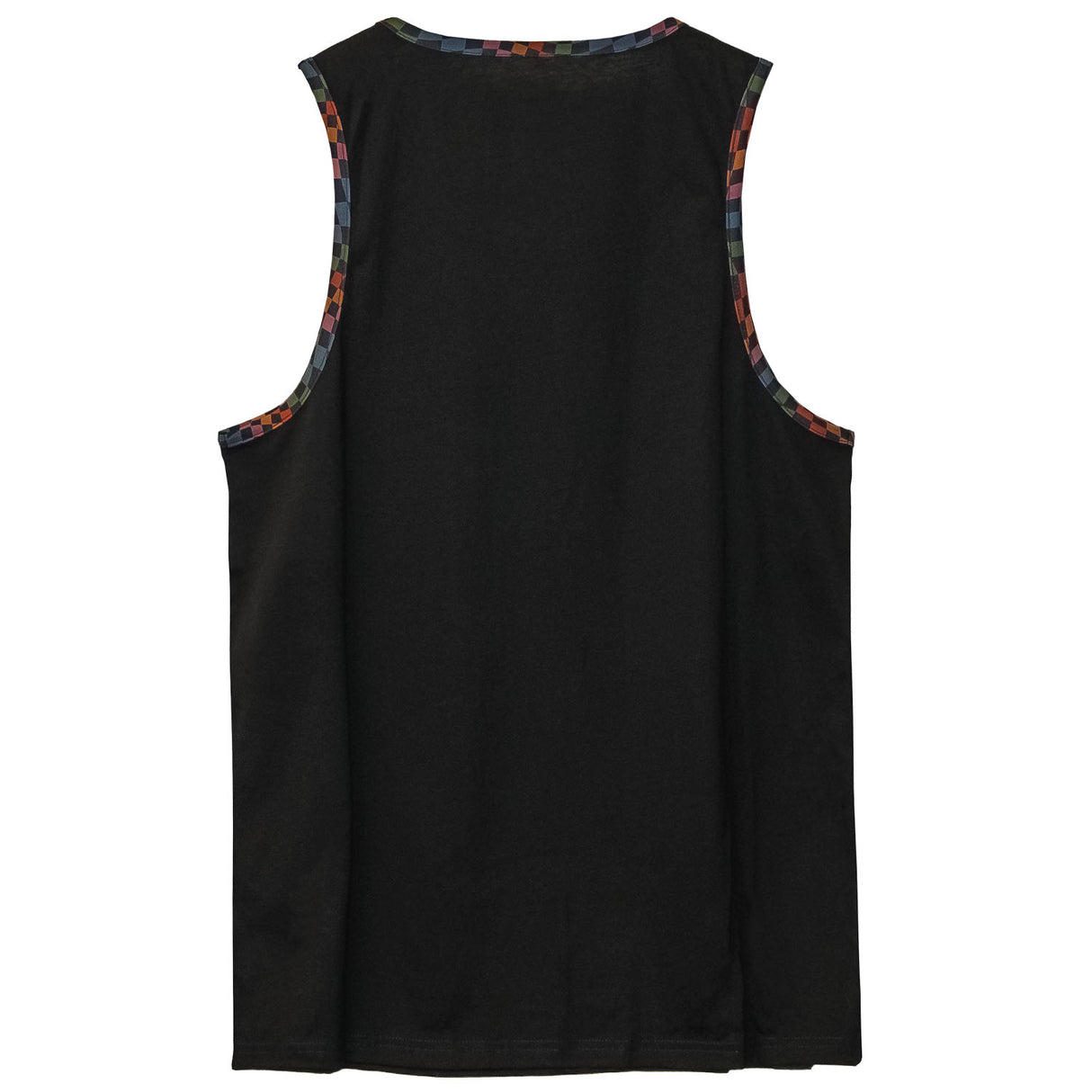 Tank Top Color: Black body with multi color checker pattern on piping & pocket