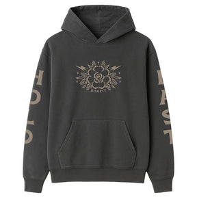 Printed on a premium, midweight pigment-dyed hoodie in deep charcoal grey. This piece features a vintage, broken-in soft feel, designed to feel like a favorite hoodie you’ve washed 100 times right out of the bag. It features the slogan "Focus Over Fear" on the back and "Hold" and "Fast" printed down each sleeve, a nod to resilience, tattoo culture, and battle-ready mentality.