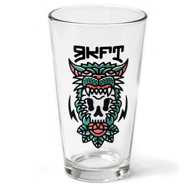 Custom designed RokFit pint glass. Graphic of a skull wearing a panther pelt. While pouring a beverage in this full of color, let the beverage color peek through parts of the art bringing the graphic to life!